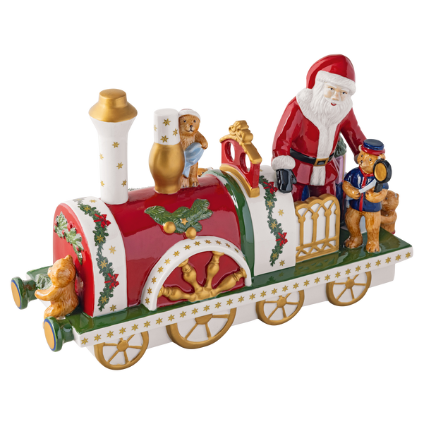 Decorazione natalizia in porcellana Premium, a forma di locomotiva con Babbo Natale e personaggi, collezione Christmas Toys Memory.